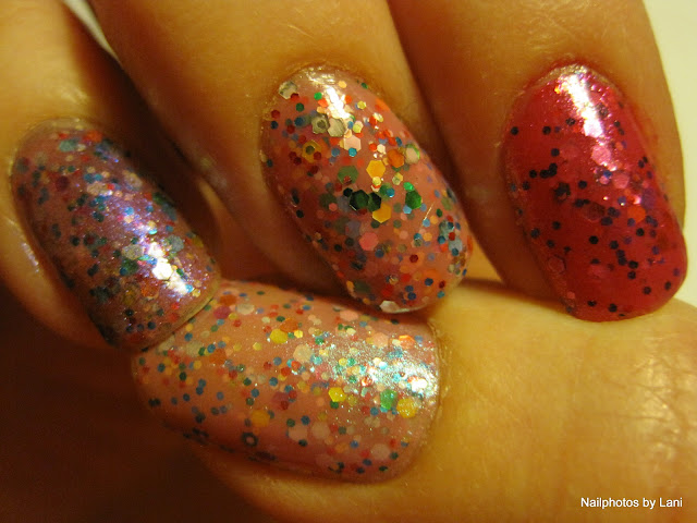 Now, it is possible to buy just the bottle. And I have seen pictures of dupes. I do not know if you see the difference when you compare with my nailphotos. On the pictures taken in sun with blue sky background, you can see that DL's Candy Shop consists of large and small hexagonal multicolored glitter in a "bubble gum pink" (as the color is described on the box) base. (These 2 photos does not show the pink base so well.)