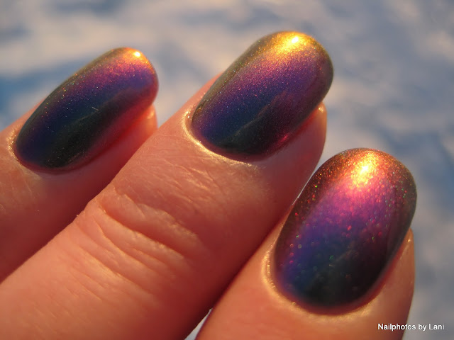 This polish has the ability to make people happy. I think it is my favourite nail polish. I need to wear Nfu- Oh 51 soon. Magical Mystery Tour shows two or three colors at the same time most of the time. If I move the fingers in the sun it's green-blue-purple-pink-gold-brown. In the shade it's more blue-green. It also has tiny holographic particles that looks linear holographic in the sun, and like silver micro glitter in the shade. The polish has a thin consistency, but is easy to apply. I'm not an expert, but I felt that it needed extra time to dry. I also tried it over black, but managed to ruin the mani, because it was still wet. Over black it looks a little darker, but I'm not so used to wear black and dark colors on my nails. So I prefer the a little lighter version I get when I wear the polish on it's own.